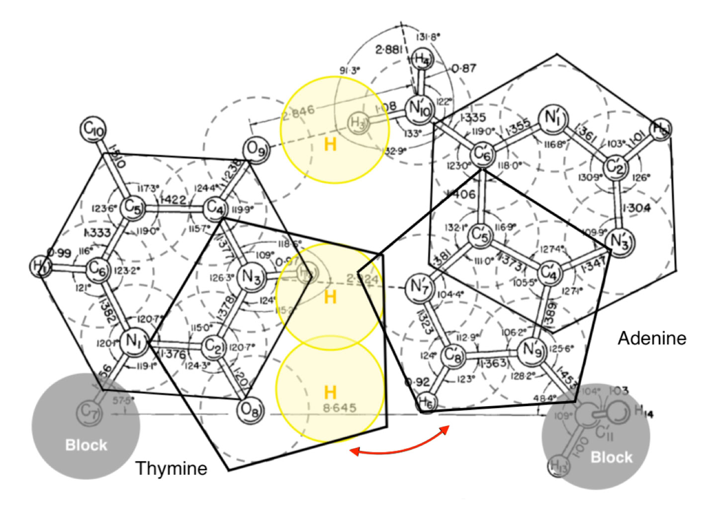 His large and beautifully illustrated diagram on page 913 of his 1963 paper (above) actually shows a collapsed version of an A/T keto base pair illustrated in my publication. The same diagram is shown with geometric over-drawing (below).